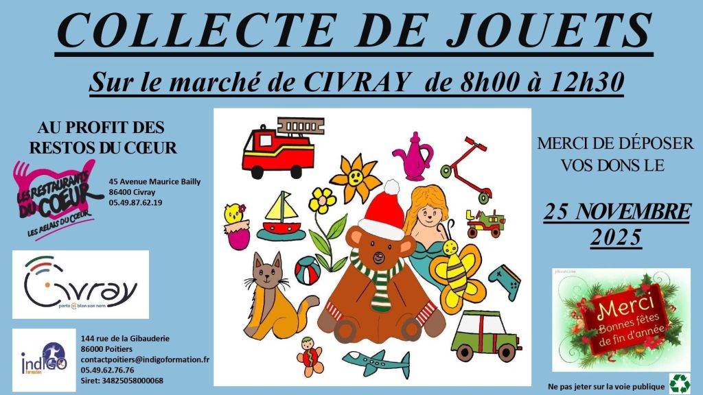 CIVRAY (Vienne) â La solidaritĂ© sera Ă lâhonneur le mardi 25 novembre 2025 sur le marchĂ© de Civray. De 8h00 Ă 12h30, les habitants sont invitĂ©s Ă venir dĂ©poser des jouets neufs ou en bon Ă©tat dans le cadre dâune grande collecte organisĂ©e au profit des Restos du CĆur.